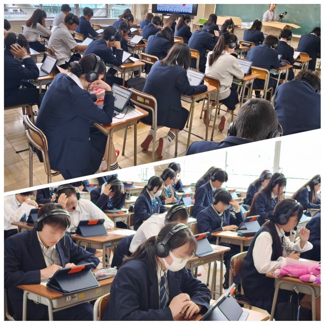 英語3技能はタブレット端末を使用したCBT(Computer Based Testing)方式での実施となり、生徒たちはヘッドセットを装着し、画面上の問題に集中して取り組んでいました。