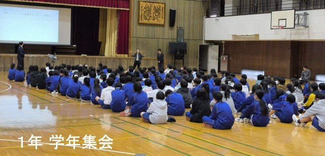 1年生は体育館で学年集会を持ちました。入学当初は新鮮な気持ちで出会い、対等な関係の中でスタートした学年集団のはずが、いつの間にか「この人だったら…」「これくらいは…」と、からかいの言葉を投げかけたり、茶化してしまう関係になっていませんか?という投げかけがありました。お互いを認め合い、相手を大切にして、プラスの言葉が自然に交わされる。そんな関係をみんなでつくっていきましょう。