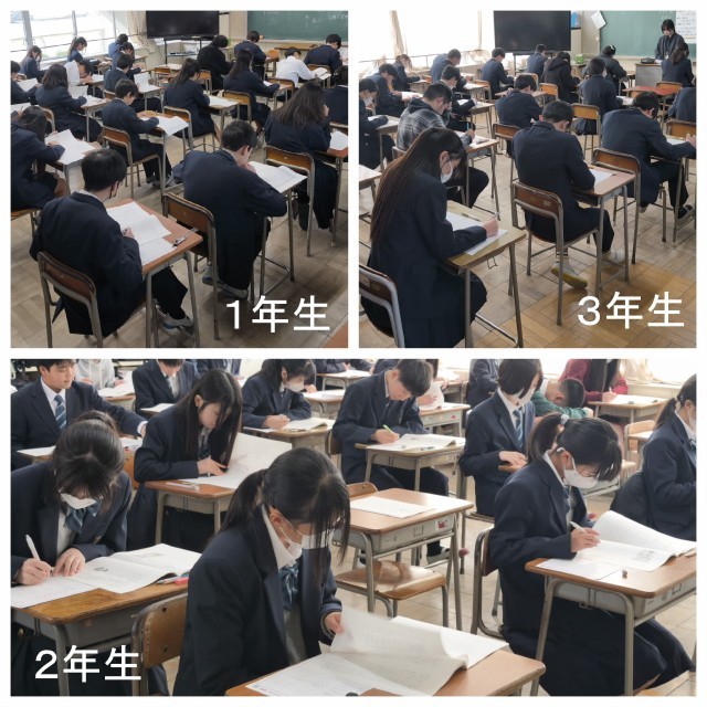 1,2年生は「大阪府チャレンジテスト」に取り組みました。定期テストとは違い、今まで学習した内容や知識をもとに、日常生活とのつながりを考えさせるような出題も多く、思考力が試されたのではないでしょうか。お疲れさまでした。結果は3月頃に提供される予定です。