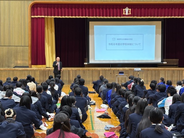 終礼前には1,2年生に体育館に集まってもらい、来年度の学校体制についての説明を行いました。本日、プリントも配布しておりますので、ご家庭でもご確認ください。