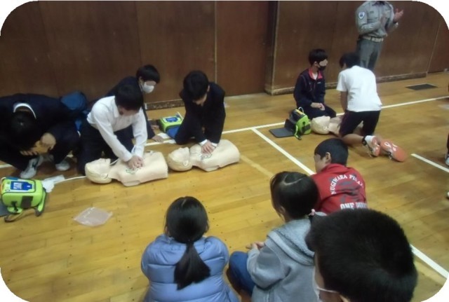 11/28(金)2年生が地域防災訓練に取り組みました。この訓練は、自主防災会、地域コミュニティ推進協議会の方が中心となり、石橋小学校5年生や、みつはこども園の園児、地域の方にも参加を呼びかけ毎年実施しています。今年も池田消防署と池田市危機管理課にご協力いただき、様々な訓練を実施しました。