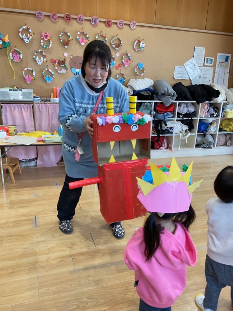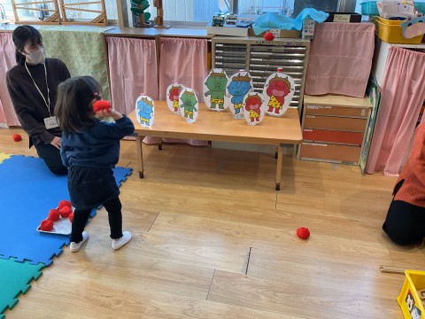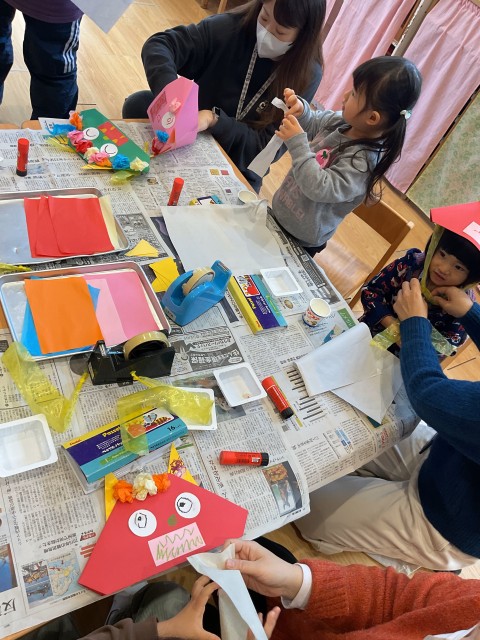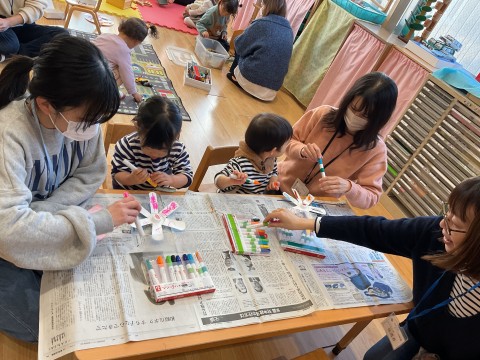 1月は、干支のリースづくり、コマづくり、また、節分に向けて鬼の面づくりを親子で楽しみました。鬼の面を作った子どもたちは、さっそく豆まきを楽しんでいました。そのほか「さくらんぼのマンボ」の親子体操をしたり、「ゆくだるまのチャチャチャ」を歌ったりして、楽しみました。