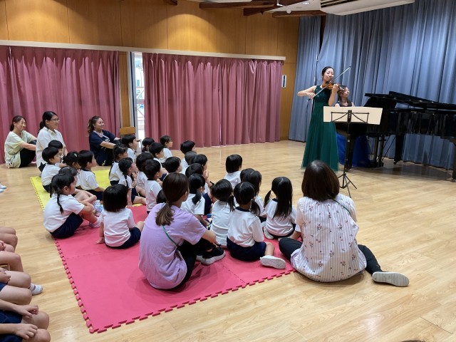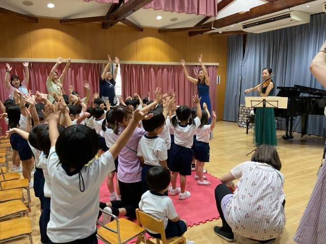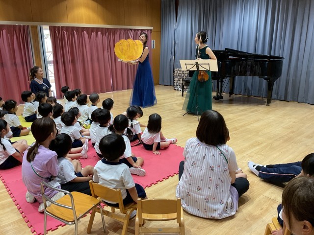9月の誕生会での”お楽しみ”は音楽鑑賞でした。「トコリコ」さんをお招きし、いろいろな曲をピアノとバイオリンで演奏していただきました。「アイネクライネ」の演奏が始まると、子どもたちは一瞬で曲の世界に入り込み、素敵な音色に聞き入っていました。「トトロメドレー」や「糸巻き」の曲のほか、「とんぼのめがね」では、手作りのトンボを飛ばしながらの演奏で、子どもたちも一緒に口ずさみながら歌っていました。「パン」を作るお話に合わせた演奏では、鍵盤ハーモニカが登場。思わず子どもから「◌ューピーや!」と声が挙がっていました。