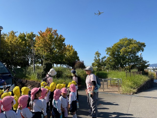 3歳児が園バスに乗って、下河原緑地公園へ園外保育に出かけました。公園に到着すると、さっそく離陸した飛行機が目の前に現れました。子どもたちは、その後もしばらく飛行機が往来する様子を見ていました。