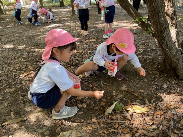 飛行機を見た後は、ドングリ拾いを楽しみました。持ってきた”ドングリ入れ”があっという間にいっぱいになるほど、子どもたちは集中してドングリを集めていました。