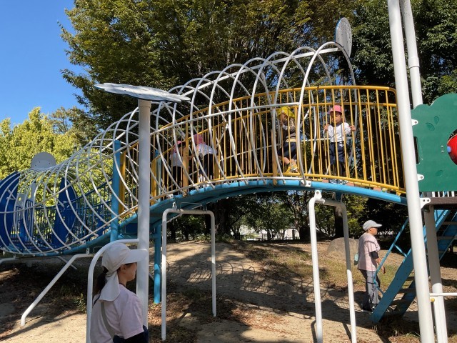 いっぱいになった”ドングリ入れ”は置いておき、最後は遊具で遊びました。子どもたちは公園内にあるさまざな遊具を楽しんでいました。