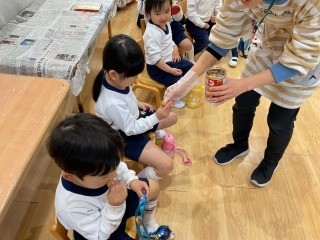 避難訓練(防災食試食) 公開日 2026/01/20 更新日 2026/01/20 子どもの様子 1月の避難訓練では、防災食の試食を行いました。 各クラスでは、年齢に合わせて紙芝居を読み聞かせたり、スライドを使ったりして、地震の怖さ、避難の大切さについて話をしました。話の後、防災食について話をし、乾パンの試食を行いました。 災害に備えておくことの大切さを、これからも繰り返し伝えていきたいと思います。 +1