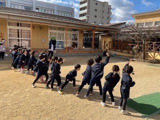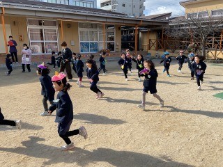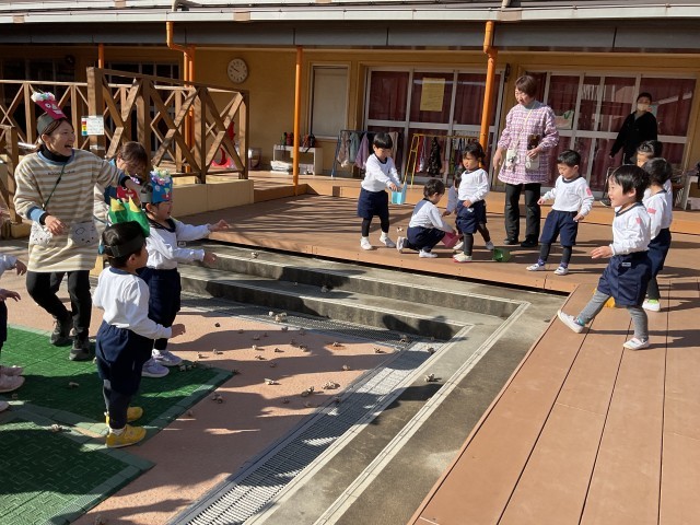 また、3歳児クラスは紙を丸めたものを豆に見立てて、4.5歳児クラスは生豆で豆まきをしました。「おには~そと!」子どもたちの元気な声とともに豆まきが始まると、鬼の役をする子どもは、自分で作った鬼の面をかぶって園庭を駆けて逃げます。投げる豆が無くなったら交代。最後は、幼稚園に福が来るようにと、「ふくは~うち」との掛け声とともに、園舎に向けて豆をまいていました。