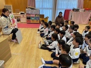 2月3日は節分。子どもたちは先生から「心の中に悪い鬼はいないかな?」「どうしてイワシの頭を柊の枝に刺しておくのかな?」など、節分にまつわる話を聞きました。