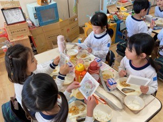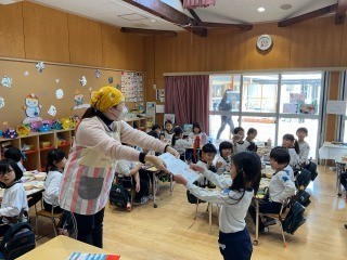 今日の給食は行事食ということで、節分にちなんだメニューでした。中でも、巻き寿司にしてたべる海苔のパッケージには、市内の小中学校や幼稚園の児童生徒や園児から募集したイラストが描かれていました。本園の園児の絵も選ばれていたことから、給食の前にクラスで表彰状の贈呈式を行いました。