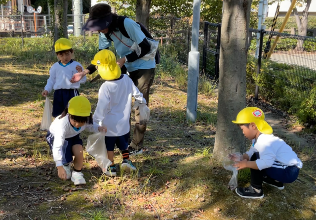公園に到着すると、大きな総合遊具があり、大喜びの子どもたちでした。公共施設での約束について話を聞いた後、遊具で遊びました。ローラー滑り台を滑ったり、はしごを渡ったり、大きな岩山を登ったりなど全身を使って遊ぶ姿が見られました。また、公園内にはドングリの木がたくさんあり、みんなでドングリ拾いもしました。「大きいドングリ、あった!」「ドングリの帽子も見つけた!」と拾い集め、袋にいっぱい入ったドングリを友達や先生にうれしそうに見せる姿も見られ、秋の自然にふれて遊ぶことを楽しんでいました。