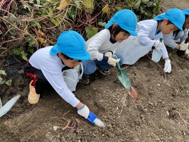バスを降りて少し歩くとサツマイモ畑が見えてきて、子どもたちは掘るのを楽しみにしていました。サツマイモのお世話をしてくださった方にご挨拶をした後、掘る場所や掘り方を教えていただき、早速サツマイモ掘りが始まりました。スコップでサツマイモを傷つけないようにとそぉっと土をすくう子どもや、力を入れて土を掘り「あっ、おイモちぎれた!」と叫ぶ子どもなどいろいろな姿が見られました。また、なかなかおイモが見えず、「だれかてつだって~」と先生や友達に助けを求める姿も見られました。掘り進めていく中で、少しでもおイモが見えてくると、やる気パワーが急に出てきて必死に掘っていました。見事、サツマイモを掘り上げると「やった~!」と大喜びで周りの友達や先生に見せていました。掘ったサツマイモはお家に持って帰ると知り、「なにつくってもらおうかな~」と楽しみにする声も聞かれました。翌日、「きのう、だいがくいもつくってもらってたべたよ」と教えてくれた子どももいました。