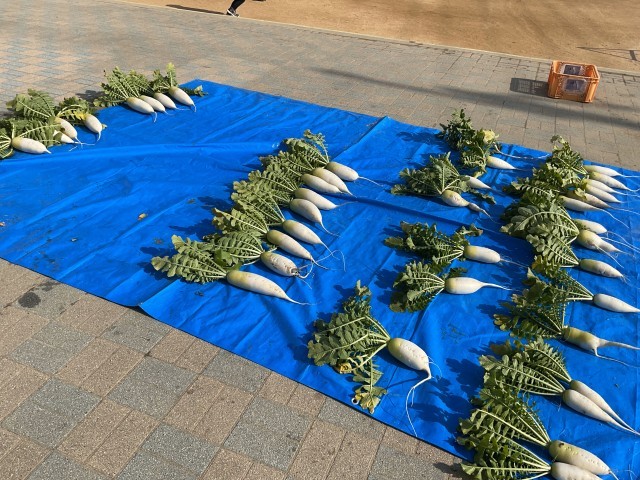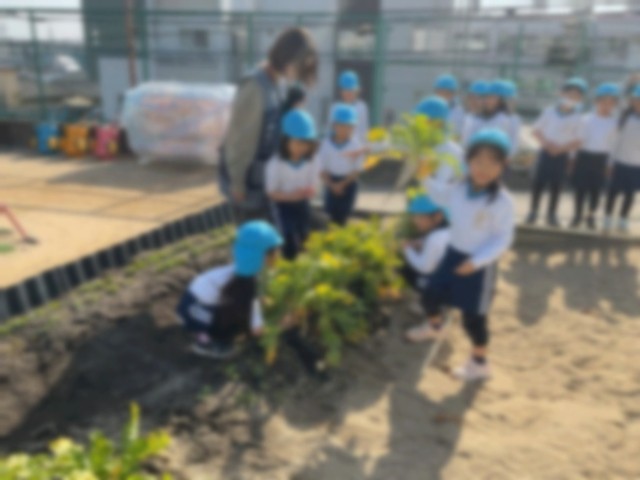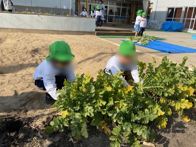 10月に種をまき、水をあげたり、雑草を抜いたりして育ててきました。芽が出てきたときには、「葉っぱが出てきたよ」「ちっちゃい」と大喜びでした。毎日、「大きくなーれ」「おいしい大根になーれ」と言いながら水やりをしていた子どもたち。自分たちで育てた大根が段々と大きくなり、葉っぱも茂ってきて、いつ収穫できるかと楽しみにしていました。一人1本ずつ大根を抜いたのですが、中には食べられていたり、細かったりする大根もありました。そこで、大きい大根は半分に切り、くじ引きをしてお家に持ち帰りました。子どもたちはお家でおいしくいただいたようで、自分が種から育てた大根を収穫した喜びを味わうことができました。