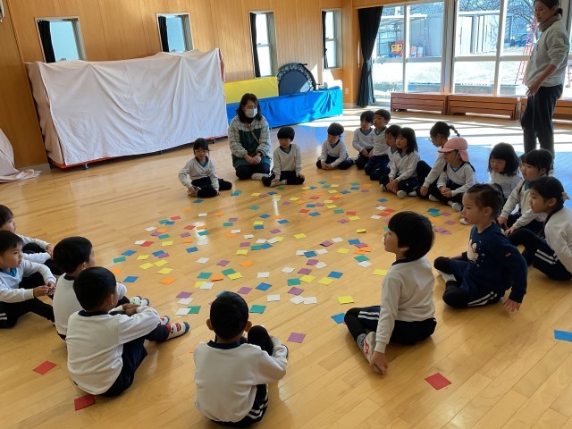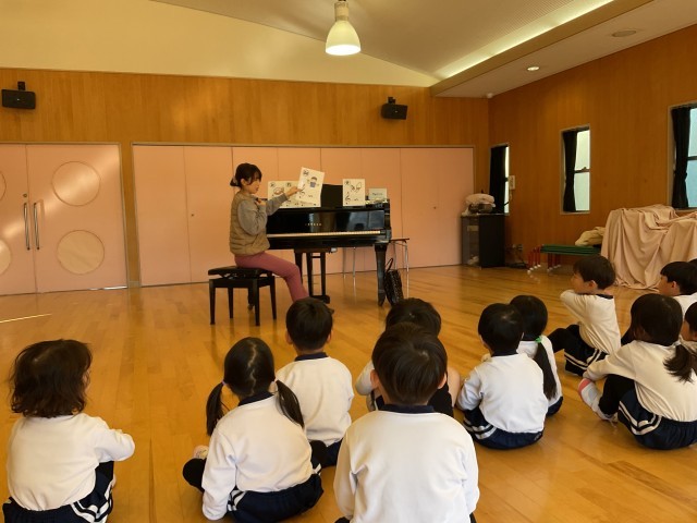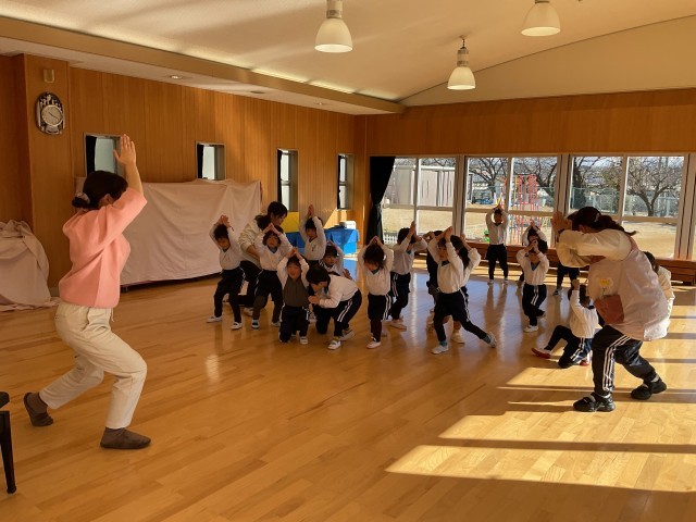 1月22日(木)・23日(水)に伊藤加奈子先生に来ていただき、3歳児みかん組・りんご組、4歳児すみれ組、5歳児ほし組がリトミックをしました。初めに曲に合わせて「♪てくてくてくてく あるいてきて~」と歩きます。「♪あくしゅで こんにちは~」と3歳児は前を向き加奈子先生に、4・5歳児は友達とペアになってごあいさつをしました。そのほかにも、ピアノの音によって歩き方を変えたり、雪だるまや雪に変身したりなど・・・音をよく聴き分けて動いていました。また、四分音符・二分音符等の音符を犬・ぞうなどの鳴き声に見立て、身体を使いながらリズムを感じている姿も見られました。4・5歳児は、色のカードを使ってドレミの音階で遊びました。子どもたちは、よく音を聴いて体を動かしたり、リズムを感じたりしてとても楽しそうでした。