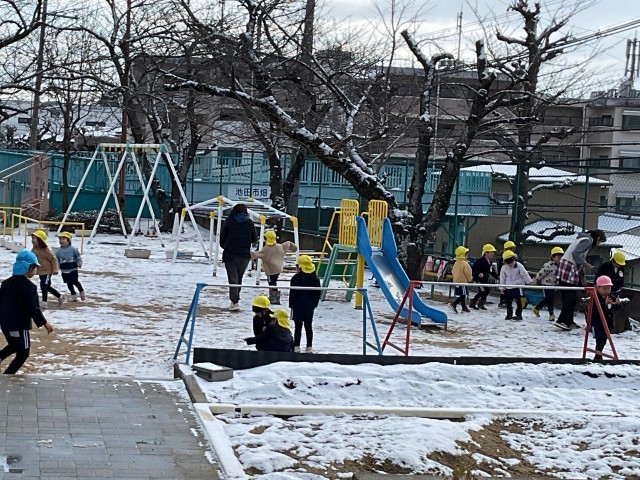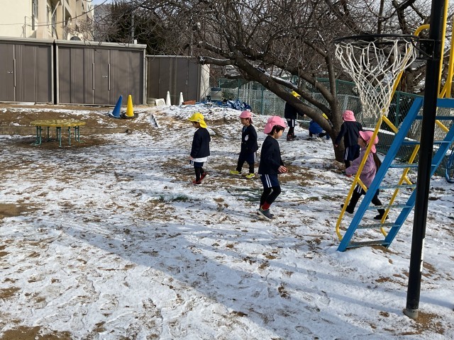 幼稚園に登園してくると、園庭も雪で真っ白。身辺整理を終えた子どもたちが大喜びで園庭に出てきていました。