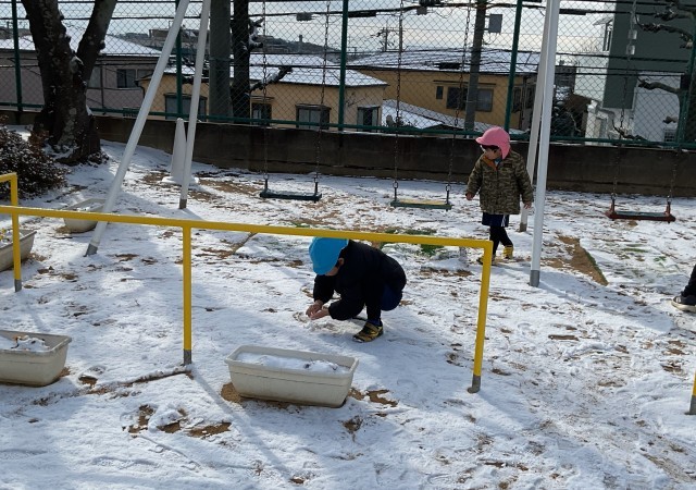 雪をかき集めて雪だるまをつくったり、先生や友達と雪合戦をしたりなど雪遊びを楽しんでいました。