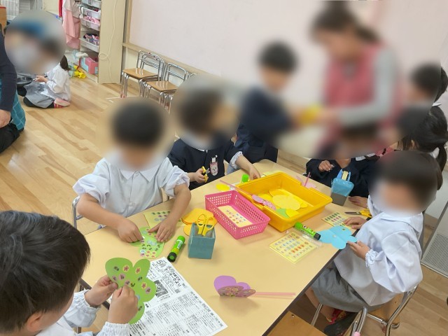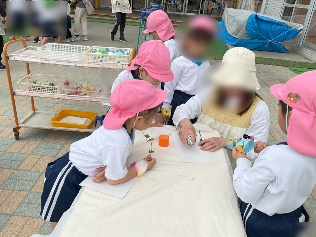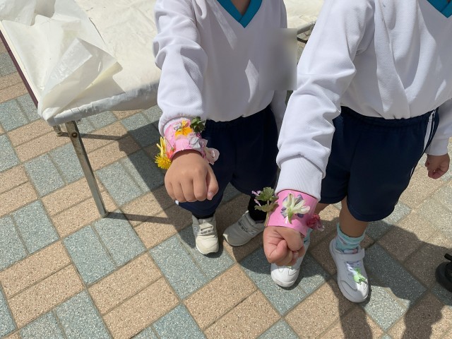 戸外では春の自然を満喫中!ブレスレットにお花をつけたり、お花を画用紙に貼って絵を描く制作遊びをしたりなど季節ならではの遊びを通して豊かな感性を育んでします。また、学年集会では、みんなで“しっぽ取り”を楽しみました。3歳児の頃は、先生のしっぽを追いかけていましたが、今回は、友達同士でしっぽを取り合っていました。逃げるのも追いかけるのも、以前よりずいぶん力強くなりました。最後まで逃げ切ったチャンピオンには、みんなから大きな拍手が送られ、とてもて嬉しそうでした。
