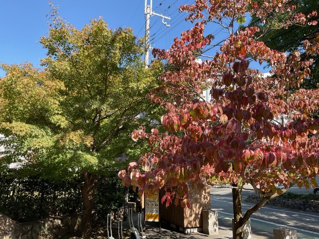 11月になりました。皆さま、お変わりありませんか。(写真は10月と同じアングルで撮りました。ハナミズキはすっかり色づいたのですが・・・)